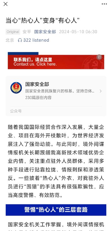 10 ΠΌΠ°Ρ ΠΠΈΠ½ΠΈΡΡΠ΅ΡΡΡΠ²ΠΎ Π³ΠΎΡΡΠ΄Π°ΡΡΡΠ²Π΅Π½Π½ΠΎΠΉ Π±Π΅Π·ΠΎΠΏΠ°ΡΠ½ΠΎΡΡΠΈ ΠΠΠ ΠΎΠΏΡΠ±Π»ΠΈΠΊΠΎΠ²Π°Π»ΠΎ Π² ΡΠ²ΠΎΠ΅ΠΌ WeChat-Π°ΠΊΠΊΠ°ΡΠ½ΡΠ΅ ΠΏΡΠ΅Π΄ΡΠΏΡΠ΅ΠΆΠ΄Π΅Π½ΠΈΠ΅ Π΄Π»Ρ ΡΠΎΡΡΡΠ΄Π½ΠΈΠΊΠΎΠ² ΠΊΠΈΡΠ°ΠΉΡΠΊΠΈΡ ΠΊΠΎΠΌΠΏΠ°Π½ΠΈΠΉ, ΠΏΡΠΎΠΆΠΈΠ²Π°ΡΡΠΈΡ Π·Π° ΡΡΠ±Π΅ΠΆΠΎΠΌ. ΠΠΎ Π·Π°ΡΠ²Π»Π΅Π½ΠΈΡ Π²Π»Π°ΡΡΠ΅ΠΉ, ΠΈΠ½ΠΎΡΡΡΠ°Π½Π½ΡΠ΅ ΡΠ»ΡΠΆΠ±Ρ Π½Π°ΡΠ΅Π»ΠΈΠ»ΠΈΡΡ Π½Π° ΠΊΡΠ°ΠΆΡ Π΄Π°Π½Π½ΡΡ ΠΎ Π²ΡΡΠΎΠΊΠΎΡΠ΅Ρ Π½ΠΎΠ»ΠΎΠ³ΠΈΡΠ½ΡΡ ΠΊΠΈΡΠ°ΠΉΡΠΊΠΈΡ ΡΠ°Π·ΡΠ°Π±ΠΎΡΠΊΠ°Ρ .