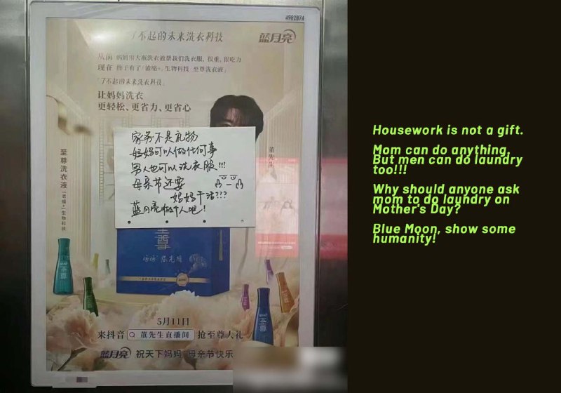 Один из ведущих китайских брендов моющих средств Blue Moon (蓝月亮) запустил рекламную кампанию ко Дню матери, который в Китае отмечали 12 мая. В ней он предложил «взять на себя» заботы о стирке и помочь маме в праздник.
