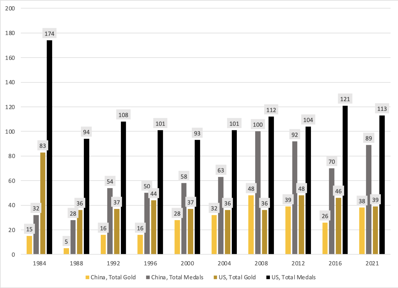 China’s rise from essentially nowhere to become the leading rival of the United States in the Olympics mirrors its rise in virtually every other dimension to become the defining geopolitical rival in the twenty-first century. Until four decades ago, China had never won a medal in the modern Olympics. Its first medal came at the 1984 Olympics in Los Angeles. A quarter century later, at the 2008 Beijing Olympics, China won forty-eight gold medals to the United State’s thirty-six. As Figure 1 shows, the United States snapped back. In Tokyo in 2021, the United States took home thirty-nine gold medals, a total of 113, compared to China’s thirty-eight and eighty-nine.
