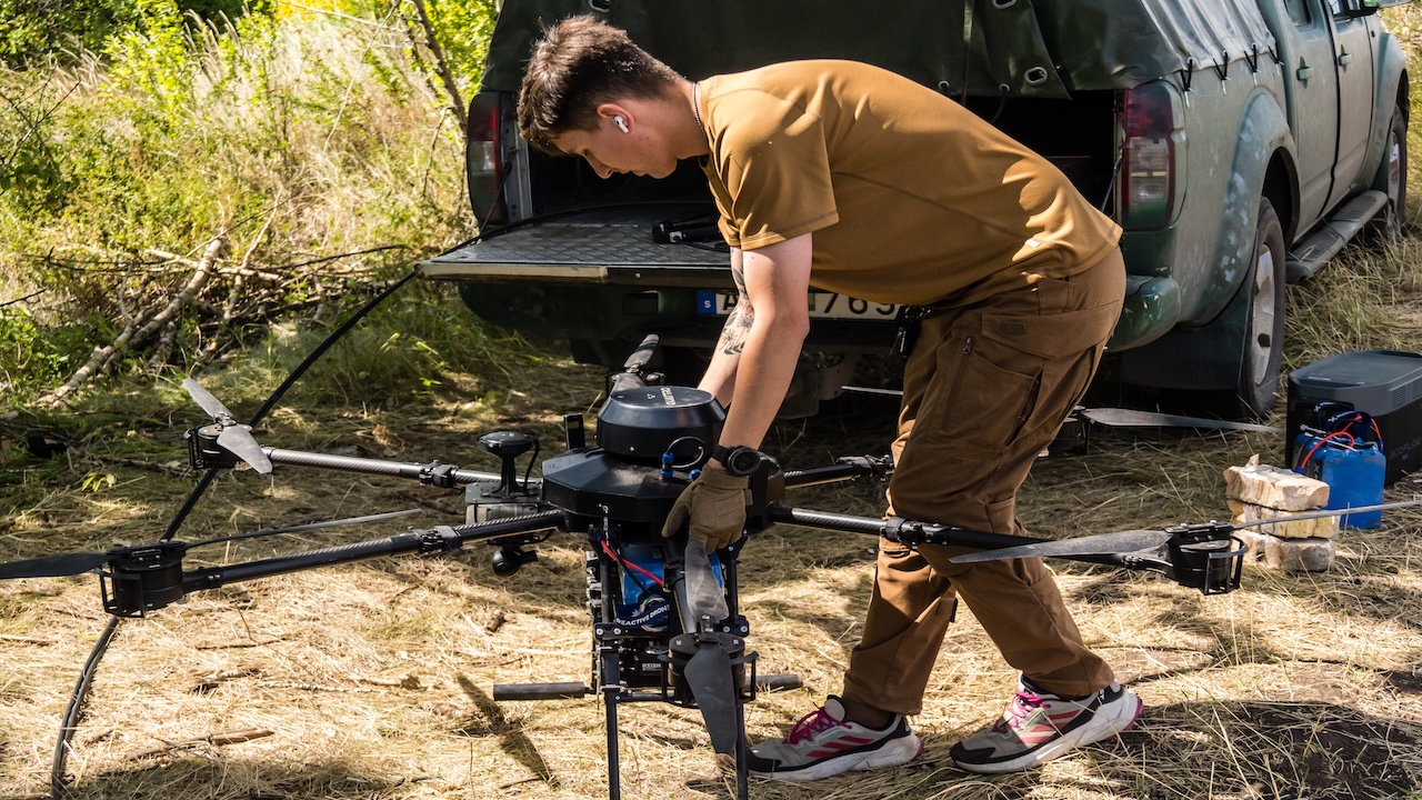 A Ukrainian soldier trains with a “Baba Yaga” drone on Aug. 13, 2025 in Donbas. (Shutterstock/Jose Hernandez Camera 51)