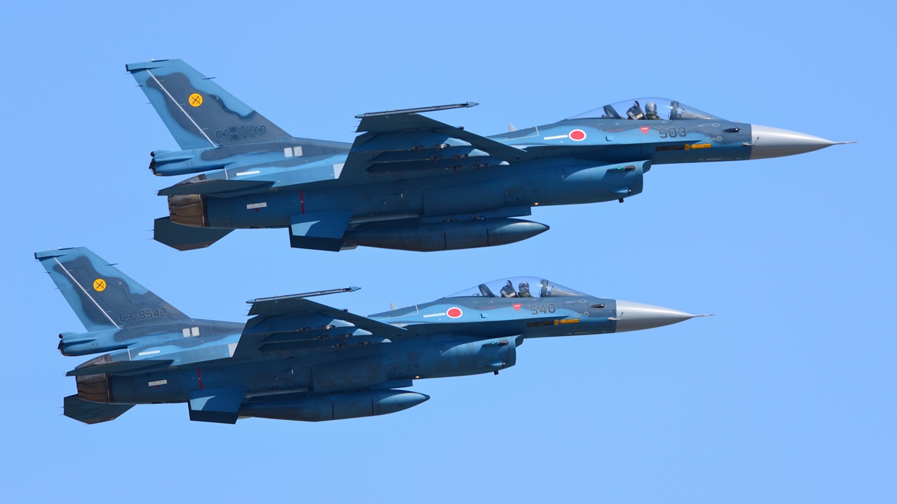 Two Mistubishi F-2A multirole fighters in the Japan Air Self-Defense Force in flight over Fukuoka, Japan, in April 2014. (Shutterstock/viper-zero)