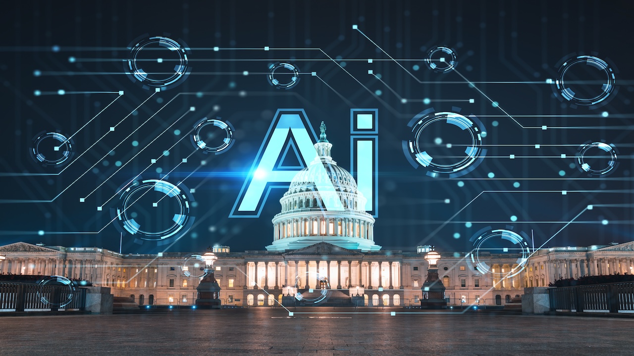 The US Capitol at night overlaid with a glowing AI symbol. As AI systems embed themselves in governance, they risk reshaping democratic accountability and shifting power away from transparent and contestable human decision-making. (Shutterstock/VideoFlow)