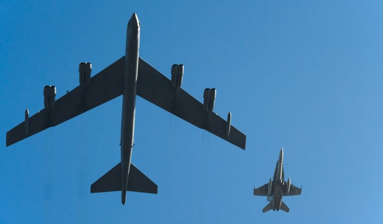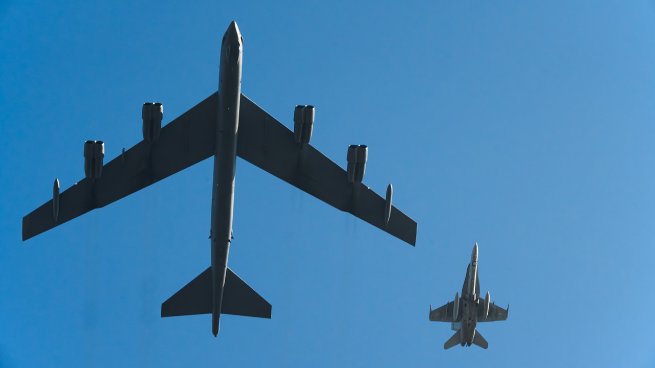 A B-52 Stratofortress and an F-16 fighter jet flying in formation against a clear blue sky. American B-52s recently participated in joint aerial exercises alongside Japan in the East China Sea. (Shutterstock/Dmitri T)