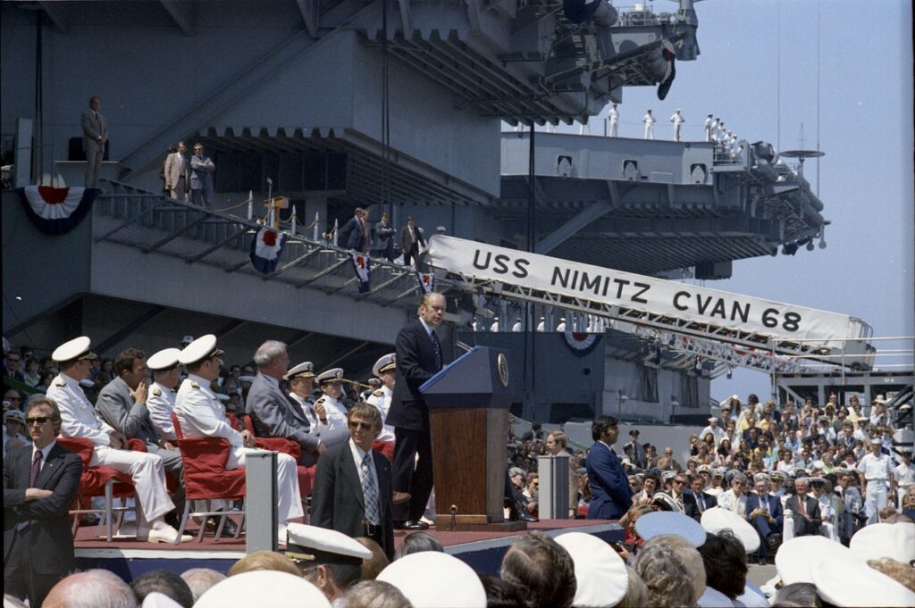 President Gerald R. Ford delivers remarks at the commissioning ceremony of the USS Nimitz in May 1975. (National Archives and Records Administration)