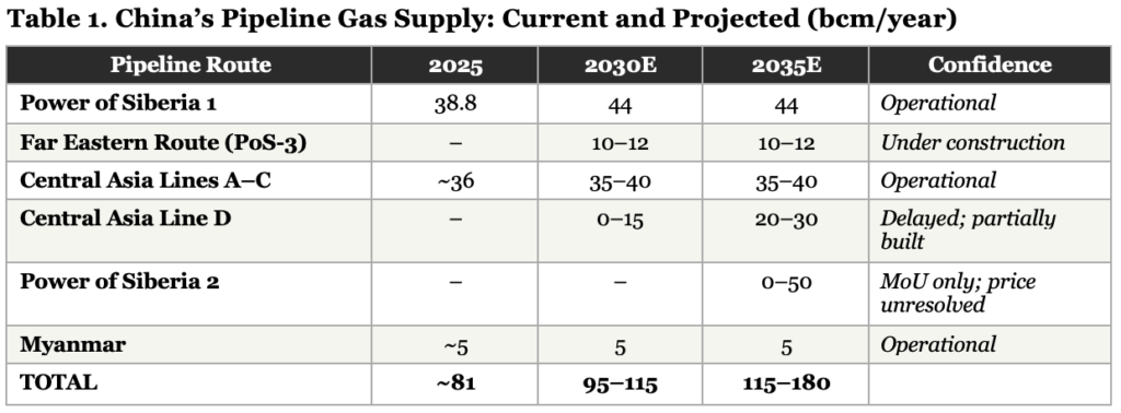 On the Central Asian side, Turkmenistan already delivers about 40 bcm a year through three parallel lines of the Central Asia-China pipeline, making it China’s single largest pipeline supplier. CNPC began Phase four commercial development of the Galkynysh field—the world’s second-largest gas deposit—in early 2026. And then there is Line D: a fourth pipeline through Tajikistan and Kyrgyzstan that would add another 30 bcm. President Xi Jinping has personally pushed Central Asian leaders to speed it up. Construction has been plagued by delays, but one critical Tajik tunnel is complete, and the political will looks stronger than at any point in the project’s tortured history.