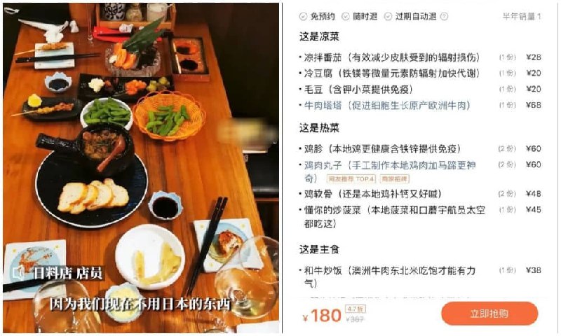 Π’Π°ΠΊ, Π½Π°ΠΏΡΠΈΠΌΠ΅Ρ, Π² ΠΎΠ΄Π½ΠΎΠΌ ΠΈΠ· ΡΠ΅ΡΡΠΎΡΠ°Π½ΠΎΠ² Π² Π¨Π°Π½Ρ Π°Π΅ Π½Π° ΡΠ»Π΅Π΄ΡΡΡΠΈΠΉ Π΄Π΅Π½Ρ ΠΏΠΎΡΠ»Π΅ Π½Π°ΡΠ°Π»Π° ΡΠ»ΠΈΠ²Π° Π²ΠΎΠ΄Ρ Ρ ΠΠΠ‘ Π²ΠΊΠ»ΡΡΠΈΠ»ΠΈ Π² ΠΌΠ΅Π½Ρ ΡΠ°ΠΊ Π½Π°Π·ΡΠ²Π°Π΅ΠΌΠΎΠ΅ Anti-radiation meal β Π½Π°Π±ΠΎΡ Π±Π»ΡΠ΄, ΠΊΠΎΡΠΎΡΡΠΉ, ΠΏΠΎ ΠΌΠ½Π΅Π½ΠΈΡ Π²Π»Π°Π΄Π΅Π»ΡΡΠ΅Π² Π·Π°Π²Π΅Π΄Π΅Π½ΠΈΡ, ΠΏΠΎΠΌΠΎΠ³Π°Π΅Ρ Π·Π°ΡΠΈΡΠΈΡΡΡΡ ΠΎΡ ΡΠ°Π΄ΠΈΠ°ΡΠΈΠΈ. Π Π΅Π³ΠΎ ΡΠΎΡΡΠ°Π² Π²Ρ ΠΎΠ΄ΡΡ ΠΏΠΎΠΌΠΈΠ΄ΠΎΡΡ, Π·Π΅Π»Π΅Π½ΡΠ΅ ΡΠΎΠ΅Π²ΡΠ΅ Π±ΠΎΠ±Ρ, ΡΠΎΡΡ ΠΈ ΡΠΏΠΈΠ½Π°Ρ. ΠΡΠ΅ ΠΈΡΠΏΠΎΠ»ΡΠ·ΠΎΠ²Π°Π½Π½ΡΠ΅ ΠΈΠ½Π³ΡΠ΅Π΄ΠΈΠ΅Π½ΡΡ Π±ΡΠ»ΠΈ Π·Π°ΠΊΡΠΏΠ»Π΅Π½Ρ, ΠΊΠ°ΠΊ ΡΠ²Π΅ΡΡΡΡ Π² ΡΠ΅ΡΡΠΎΡΠ°Π½Π΅, Ρ ΠΌΠ΅ΡΡΠ½ΡΡ ΠΏΠΎΡΡΠ°Π²ΡΠΈΠΊΠΎΠ².