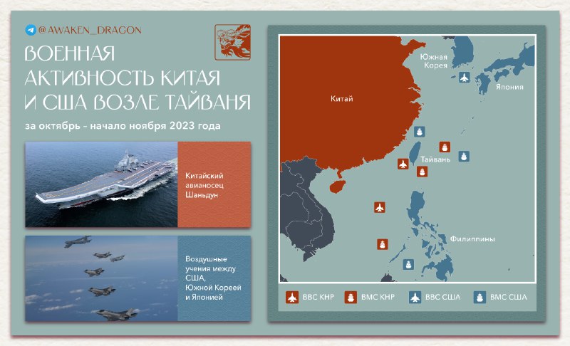 🇨🇳🇺🇸 За период с октября по начало ноября 2023 года вокруг Тайваня и в акватории Южно-Китайского моря наблюдалась активность как вооруженных сил КНР, так и кораблей и самолетов США и их союзников в регионе. Самыми примечательными действиями были: