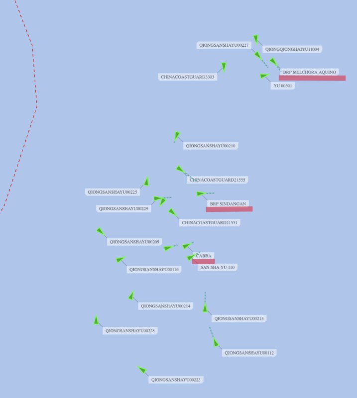 Все остальные названия — корабли китайской береговой охраны, которые хотят окружить филиппинцев и выпроводить их из акватории рядом со Второй отмелью Томаса.