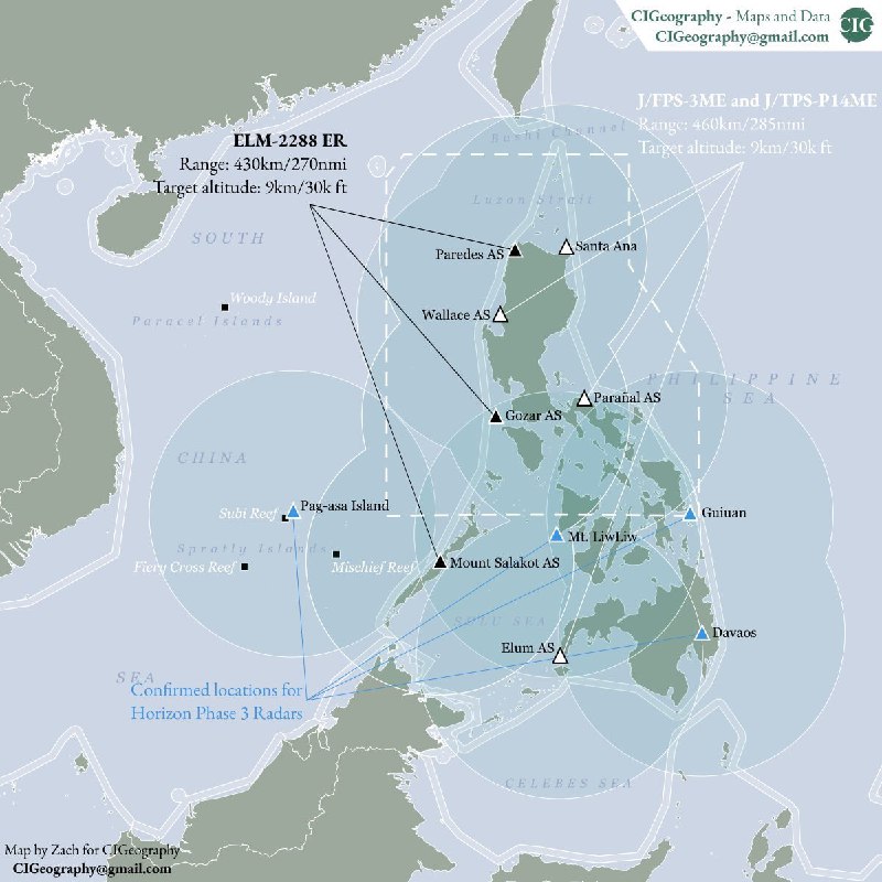 Помимо японской помощи, Манила также закупила необходимое оборудование у Израиля (на карте отмечены в виде черных треугольников). Синим изображены еще не приобретенные РЛС в рамках третьей фазы укрепления обороны Филиппин.