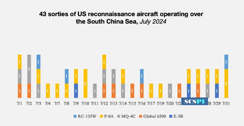 🇺🇸🇵🇭 Если вы думали, что американские беспилотники никак не участвуют в конфликте в Южно-Китайском море, то вы ошибаетесь. За июль 2024 года БЛА совершили 42 полета над акваторией (1 фото).