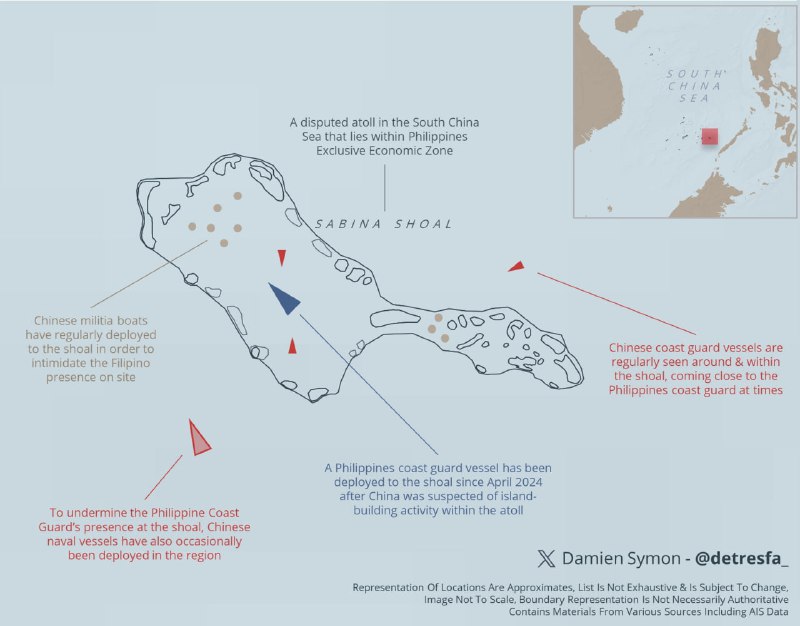 ▪️Во-первых, BRP Teresa Magbanua постоянно находится на отмели Сабина еще с апреля. Филиппинцы заявляют, что это превентивная мера, так как китайцы, по их мнению, в скором времени начнут там рекламационные работы. Простым языком, планируется стройка искусственного острова.