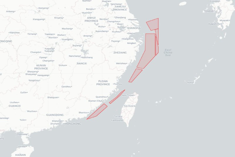 🇨🇳🇹🇼 Сегодня, кажется, начались очередные масштабные учения КНР. В Пекине выделили семь зон ограничения полётов к востоку от провинций Чжэцзян и Фуцзянь. Предполагается, что на этих территориях будут проводиться учения с 9 по 11 декабря. На Тайване уже предпринимают меры по реагированию, а местные СМИ предрекают начало нового этапа тренировок Joint Sword — 2024, но только под буквой C.