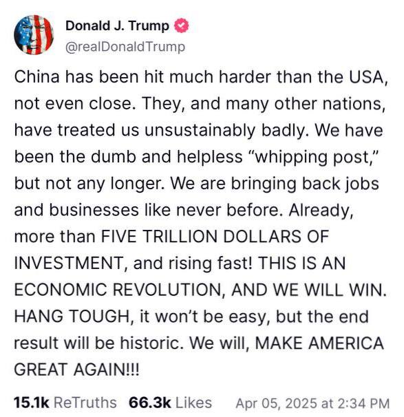 По его словам, происходит «экономическая революция», которая будет нелегкой, однако в итоге США придут к историческому результату. Он также сказал, что больше всего от пошлин США пострадал Китай, а Соединенные Штаты — «даже не близко».