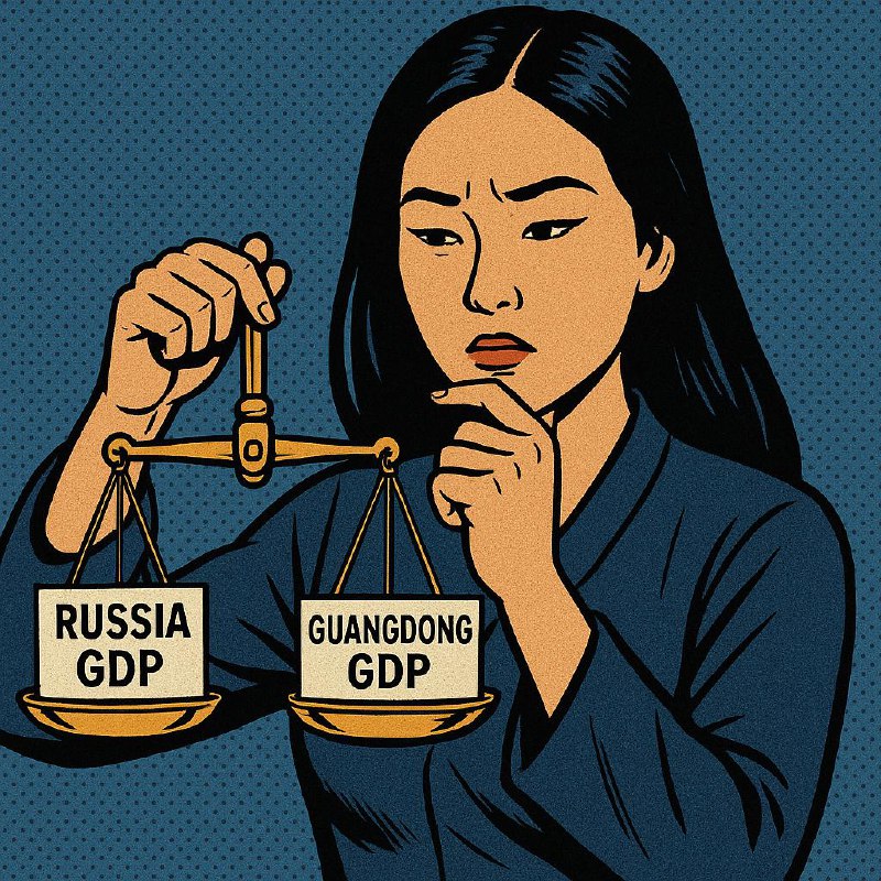 От китайских собеседников часто можно услышать, что ВВП России такой же, как ВВП всего одной китайской провинции Гуандун. Вчера, например, эту фразу написал бывший главред моей любимой китайской газеты по внешней политике «Глобал таймс» Ху Сицзинь (цитату в своем канале приводит китаист Светлана Селиванова).