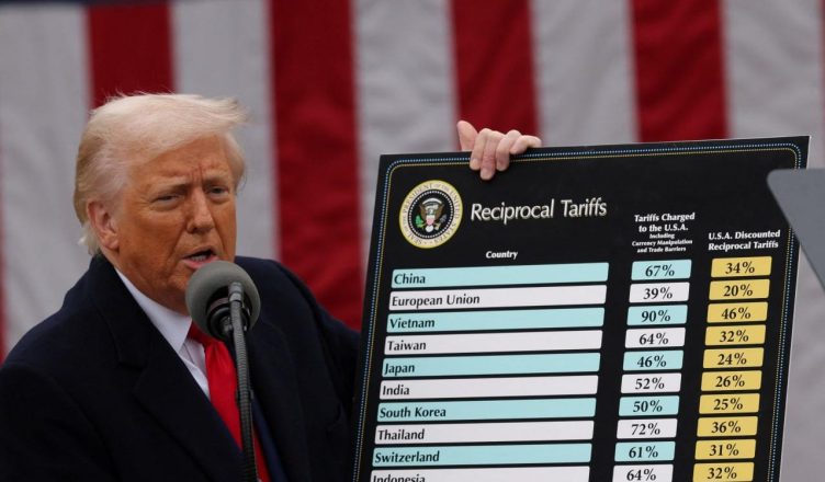 Вот на фото Трамп показывает скрижали — синим там это «Их отвратительные и хищнические тарифы в отношении США», а желтым — «Наши американские благородные и сдержанные ответные меры в отношении этих негодяев». И в этой таблице указано, что китайские тарифы в отношении США составляют 67%!