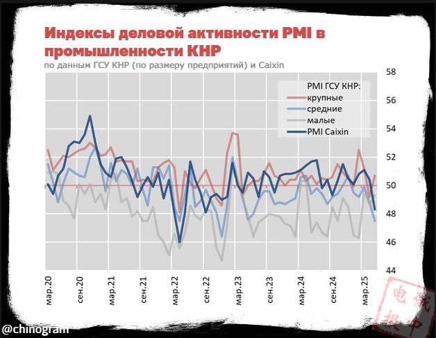 ▫️Различия в динамике двух индексов связаны с разницей в размере в размере выборки и составу опрашиваемых компаний. Выборка Caixin меньше, чем у ГСУ (500 vs 3000) и также имеет другую отраслевую и географическую структуру (более высокая доля экспортно-ориентированных предприятий из прибрежных регионов на востоке страны).