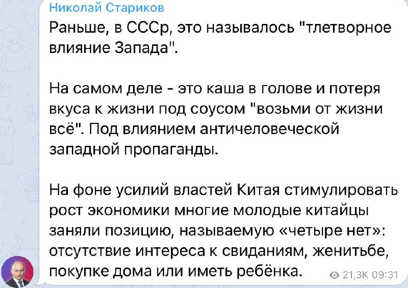 ΠΡ Π°Ρ Π°. ΠΠ΅Π΄ΡΡΠΈΠΉ ΡΠΎΡΡΠΈΠΉΡΠΊΠΈΠΉ ΠΏΡΠΎΠΏΠ°Π³Π°Π½Π΄ΠΈΡΡ Π³ΠΎΡΠΏΠΎΠ΄ΠΈΠ½ Π‘ΡΠ°ΡΠΈΠΊΠΎΠ² Π·Π°ΠΌΠ΅Π½ΠΈΠ» ΡΡΠ΅Π½ΠΈΠ΅ The Washington Post, ΠΈΠ· ΠΊΠΎΡΠΎΡΠΎΠ³ΠΎ ΠΎΠ½ ΡΠ°Π½ΡΡΠ΅ Π΄Π΅Π»Π°Π» Π²ΡΠ²ΠΎΠ΄Ρ, ΡΡΠΎ Π½Π΅ΠΆΠ΅Π»Π°Π½ΠΈΠ΅ ΠΊΠΈΡΠ°ΠΉΡΠ΅Π² ΡΠ°Π·ΠΌΠ½ΠΎΠΆΠ°ΡΡΡΡ ΡΠ²Π»ΡΠ΅ΡΡΡ ΡΠ»Π΅Π΄ΡΡΠ²ΠΈΠ΅ΠΌ Π°Π½ΡΠΈΡΠ΅Π»ΠΎΠ²Π΅ΡΠ΅ΡΠΊΠΎΠΉ Π·Π°ΠΏΠ°Π΄Π½ΠΎΠΉ ΠΏΡΠΎΠΏΠ°Π³Π°Π½Π΄Ρ