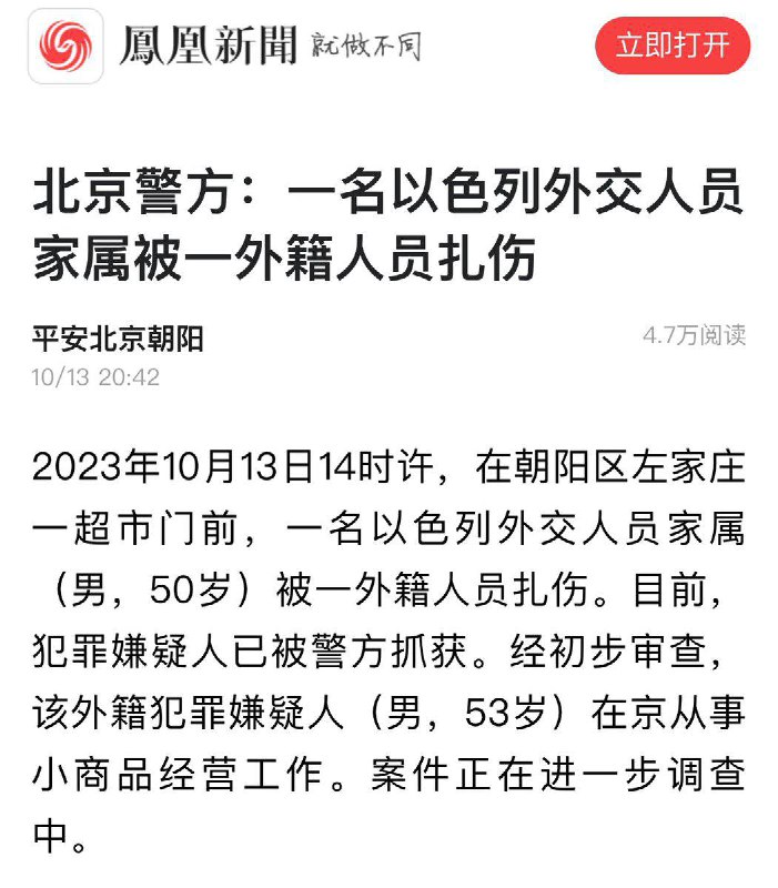 ΠΠΊΠΎΠ»ΠΎ 14:00 13 ΠΎΠΊΡΡΠ±ΡΡ 2023 Π³ΠΎΠ΄Π° Π½Π° ΡΠ»ΠΈΡΠ΅ Π¦Π·ΠΎΡΠ·ΡΡΠΆΡΠ°Π½ ΡΠ°ΠΉΠΎΠ½Π° Π§Π°ΠΎΡΠ½ ΡΠ»Π΅Π½ ΡΠ΅ΠΌΡΠΈ ΠΈΠ·ΡΠ°ΠΈΠ»ΡΡΠΊΠΎΠ³ΠΎ Π΄ΠΈΠΏΠ»ΠΎΠΌΠ°ΡΠ° (ΠΌΡΠΆΡΠΈΠ½Π°, 50 Π»Π΅Ρ) ΠΏΠΎΠ»ΡΡΠΈΠ» Π½ΠΎΠΆΠ΅Π²ΠΎΠ΅ ΡΠ°Π½Π΅Π½ΠΈΠ΅ ΠΎΡ ΠΈΠ½ΠΎΡΡΡΠ°Π½ΡΠ°. Π Π½Π°ΡΡΠΎΡΡΠ΅Π΅ Π²ΡΠ΅ΠΌΡ ΠΏΠΎΠ΄ΠΎΠ·ΡΠ΅Π²Π°Π΅ΠΌΡΠΉ Π·Π°Π΄Π΅ΡΠΆΠ°Π½ ΠΏΠΎΠ»ΠΈΡΠΈΠ΅ΠΉ.