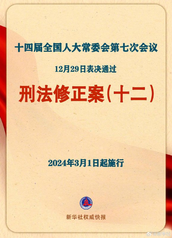 БСдьмая сСссия ΠŸΠΎΡΡ‚ΠΎΡΠ½Π½ΠΎΠ³ΠΎ ΠΊΠΎΠΌΠΈΡ‚Π΅Ρ‚Π° ВсСкитайского собрания Π½Π°Ρ€ΠΎΠ΄Π½Ρ‹Ρ… прСдставитСлСй проголосовала Π·Π° принятиС ΠΏΠΎΠΏΡ€Π°Π²ΠΊΠΈ ΠΊ Π£Π³ΠΎΠ»ΠΎΠ²Π½ΠΎΠΌΡƒ кодСксу, которая вступит Π² силу 1 ΠΌΠ°Ρ€Ρ‚Π° 2024 Π³ΠΎΠ΄Π°.