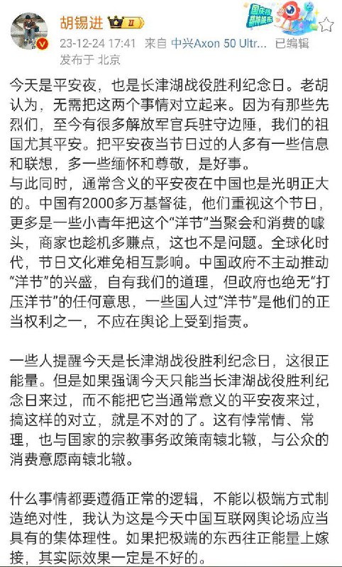 Β«Π‘Π΅Π³ΠΎΠ΄Π½Ρ ΡΠΎΡΠ΅Π»ΡΠ½ΠΈΠΊ ΠΈ Π³ΠΎΠ΄ΠΎΠ²ΡΠΈΠ½Π° ΠΏΠΎΠ±Π΅Π΄Ρ Π² Π±ΠΈΡΠ²Π΅ Ρ Π§ΠΎΡΠΈΠ½ΡΠΊΠΎΠ³ΠΎ Π²ΠΎΠ΄ΠΎΡ ΡΠ°Π½ΠΈΠ»ΠΈΡΠ°. ΠΠ΅Ρ Π½Π΅ΠΎΠ±Ρ ΠΎΠ΄ΠΈΠΌΠΎΡΡΠΈ ΠΏΡΠΎΡΠΈΠ²ΠΎΠΏΠΎΡΡΠ°Π²Π»ΡΡΡ ΡΡΠΈ Π΄Π²Π° ΡΠΎΠ±ΡΡΠΈΡ. Π ΠΠΈΡΠ°Π΅ Π±ΠΎΠ»Π΅Π΅ 20 ΠΌΠΈΠ»Π»ΠΈΠΎΠ½ΠΎΠ² Ρ ΡΠΈΡΡΠΈΠ°Π½, ΠΈ ΠΎΠ½ΠΈ ΠΏΡΠΈΠ΄Π°ΡΡ Π±ΠΎΠ»ΡΡΠΎΠ΅ Π·Π½Π°ΡΠ΅Π½ΠΈΠ΅ ΠΏΡΠ°Π·Π΄Π½ΠΎΠ²Π°Π½ΠΈΡ Π ΠΎΠΆΠ΄Π΅ΡΡΠ²Π°. ΠΠΈΡΠ°ΠΉΡΠΊΠΎΠ΅ ΠΏΡΠ°Π²ΠΈΡΠ΅Π»ΡΡΡΠ²ΠΎ Π½Π΅ ΠΏΡΠΎΡΠ²Π»ΡΠ΅Ρ ΠΈΠ½ΠΈΡΠΈΠ°ΡΠΈΠ², ΡΡΠΎΠ±Ρ ΡΠΎΠ΄Π΅ΠΉΡΡΠ²ΠΎΠ²Π°ΡΡ ΠΏΡΠΎΡΠ²Π΅ΡΠ°Π½ΠΈΡ ΠΈΠ½ΠΎΡΡΡΠ°Π½Π½ΡΡ ΠΏΡΠ°Π·Π΄Π½ΠΈΠΊΠΎΠ², Π½ΠΎ ΠΈ Π½Π΅ Π½Π°ΠΌΠ΅ΡΠ΅Π½ΠΎ ΠΈΡ ΠΏΠΎΠ΄Π°Π²Π»ΡΡΡ. ΠΠ»Ρ Π½Π΅ΠΊΠΎΡΠΎΡΡΡ ΠΊΠΈΡΠ°ΠΉΡΠ΅Π² ΠΏΡΠ°Π·Π΄Π½ΠΎΠ²Π°Π½ΠΈΠ΅ Π ΠΎΠΆΠ΄Π΅ΡΡΠ²Π° ΡΠ²Π»ΡΠ΅ΡΡΡ ΠΎΠ΄Π½ΠΈΠΌ ΠΈΠ· ΠΈΡ Π·Π°ΠΊΠΎΠ½Π½ΡΡ ΠΏΡΠ°Π², ΠΈ ΠΎΠ½ΠΈ Π½Π΅ Π΄ΠΎΠ»ΠΆΠ½Ρ Π±ΡΡΡ ΠΎΠ±Π²ΠΈΠ½Π΅Π½Π½ΡΠΌΠΈ Π² ΠΎΠ±ΡΠ΅ΡΡΠ²Π΅Π½Π½ΠΎΠΌ ΠΌΠ½Π΅Π½ΠΈΠΈΒ».