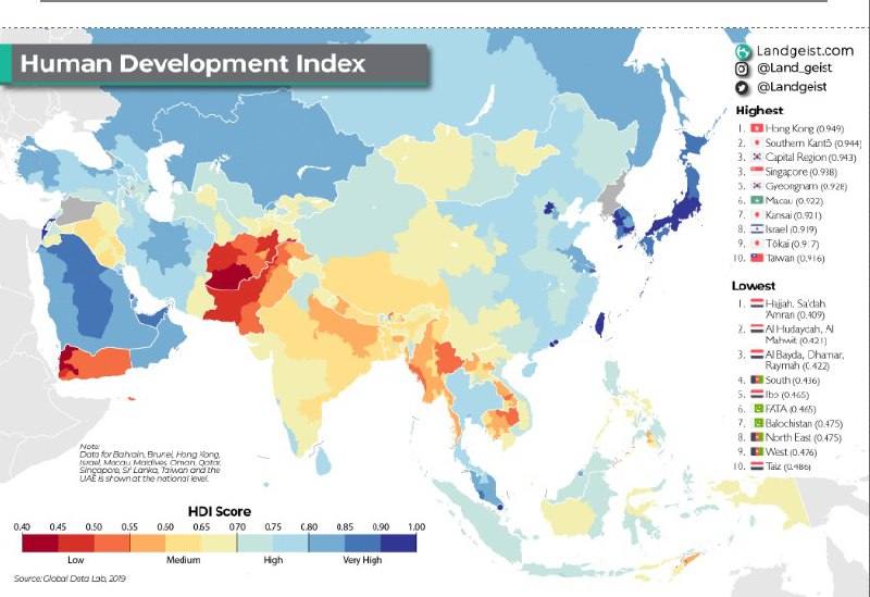 Это уровень ИЧР в Азии (правда, на предыдущей карте были данные по 2021 году, на этой – по 2019).Здесь я бы в первую очередь обратил внимание на Индекс человеческого развития в Китае. Уже чуть ли не на госуровне россиян заставляют…