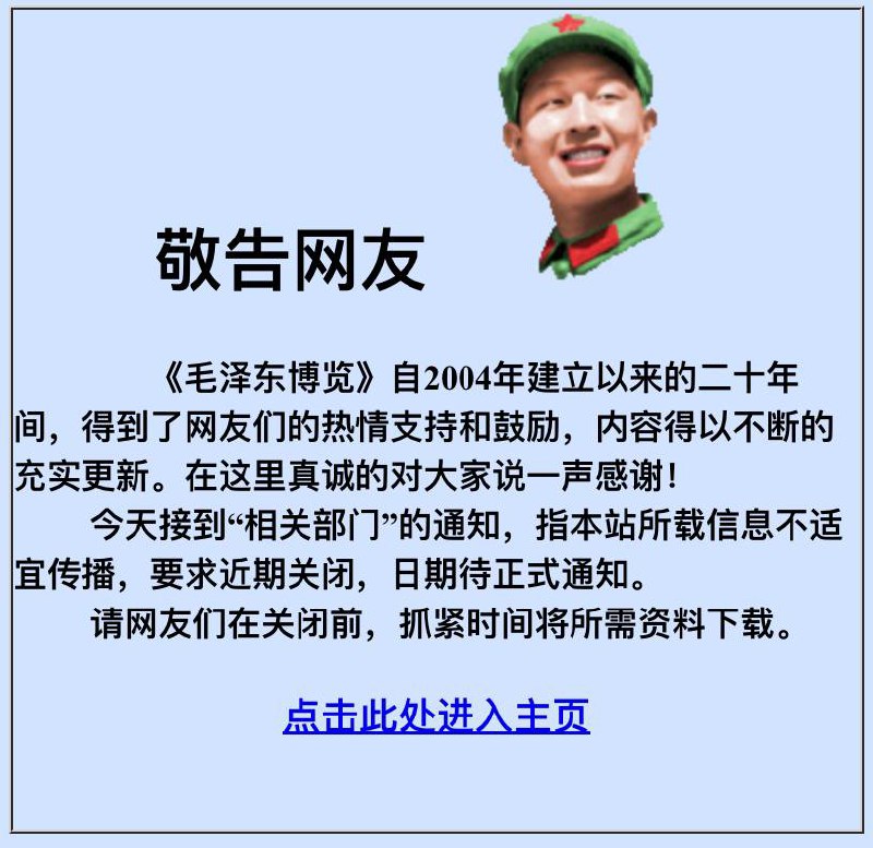 Π ΠΠΈΡΠ°Π΅ Π·Π°ΠΊΡΠΎΡΡ ΡΠ°ΠΉΡ, ΠΏΠΎΡΠ²ΡΡΠ΅Π½Π½ΡΠΉ ΠΠ°ΠΎ Π¦Π·ΡΠ΄ΡΠ½Ρ http://www.mzdbl.cn , Π³Π΄Π΅ Ρ ΡΠ°Π½ΠΈΠ»ΠΈΡΡ ΠΈΡΡΠΎΡΠΈΡΠ΅ΡΠΊΠΈΠ΅ Π΄ΠΎΠΊΡΠΌΠ΅Π½ΡΡ ΠΈ ΠΌΠ°ΡΠ΅ΡΠΈΠ°Π»Ρ, ΡΠ²ΡΠ·Π°Π½Π½ΡΠ΅ Ρ ΠΠ΅Π»ΠΈΠΊΠΈΠΌ ΠΊΠΎΡΠΌΡΠΈΠΌ.