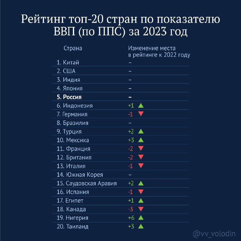 Вячеслав ВолодинОпубликован новый рейтинг стран за 2023 год (по показателю ВВП по ППС).