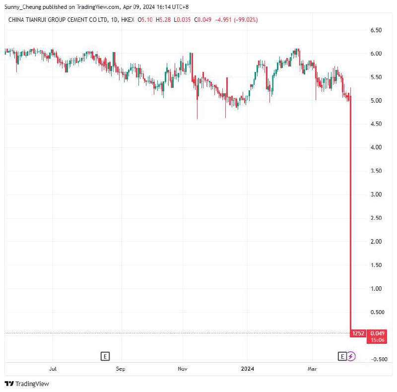 Акции китайской ΠΊΠΎΠΌΠΏΠ°Π½ΠΈΠΈ Tianrui Cement с Ρ€Ρ‹Π½ΠΎΡ‡Π½ΠΎΠΉ ΠΊΠ°ΠΏΠΈΡ‚Π°Π»ΠΈΠ·Π°Ρ†ΠΈΠ΅ΠΉ Π² 10 ΠΌΠΈΠ»Π»ΠΈΠ°Ρ€Π΄ΠΎΠ² Π²Π½Π΅Π·Π°ΠΏΠ½ΠΎ Ρ€ΡƒΡ…Π½ΡƒΠ»ΠΈ Π½Π° Π±ΠΈΡ€ΠΆΠ΅ Π² Π“ΠΎΠ½ΠΊΠΎΠ½Π³Π΅ Π½Π° 99% с 5 юанСй Π΄ΠΎ 0,035 Π·Π° 15 ΠΌΠΈΠ½ΡƒΡ‚ Π΄ΠΎ закрытия Ρ€Ρ‹Π½ΠΊΠ°.