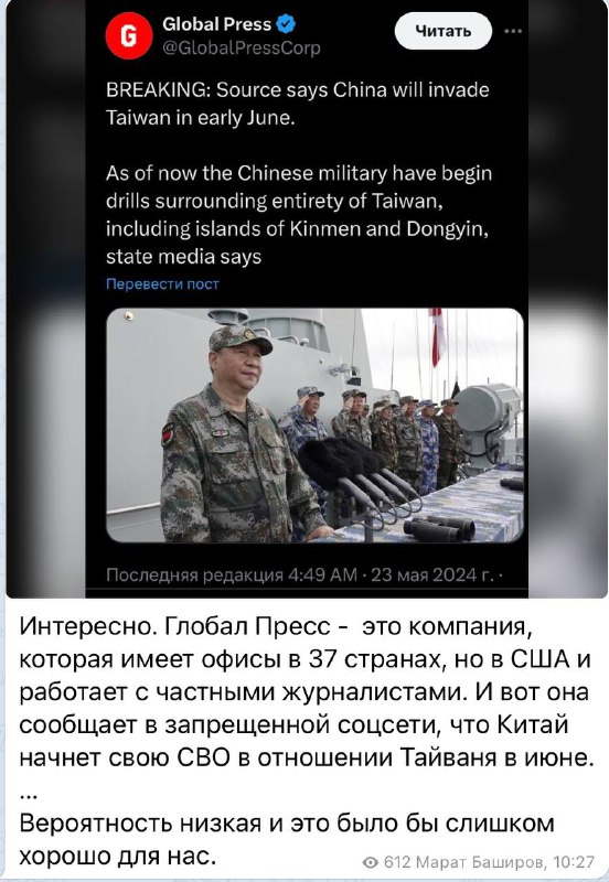 Партия сторонников войны с Тайванем в России намного больше, чем в самом Китае 😁