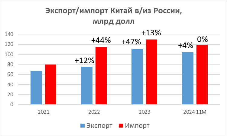 ΠΠΎ ΠΈΡΠΎΠ³Π°ΠΌ 11 ΠΌΠ΅ΡΡΡΠ΅Π² 2024 Π³. ΠΎΠ±ΡΠ΅ΠΌ ΡΠΊΡΠΏΠΎΡΡΠ° ΠΈΠ· ΠΠΈΡΠ°Ρ Π² Π ΠΎΡΡΠΈΡ Π²ΡΡΠΎΡ Π²ΡΠ΅Π³ΠΎ Π½Π° 4% Π΄ΠΎ 104 ΠΌΠ»ΡΠ΄ Π΄ΠΎΠ»Π», ΡΠΎΠ³Π΄Π° ΠΊΠ°ΠΊ ΠΎΠ±ΡΠ΅ΠΌ ΠΈΠΌΠΏΠΎΡΡΠ° ΠΈΠ· Π ΠΎΡΡΠΈΠΈ ΠΎΡΡΠ°Π»ΡΡ Π±Π΅Π· ΠΈΠ·ΠΌΠ΅Π½Π΅Π½ΠΈΠΉ Π½Π° ΡΡΠΎΠ²Π½Π΅ 114 ΠΌΠ»ΡΠ΄ Π΄ΠΎΠ»Π».