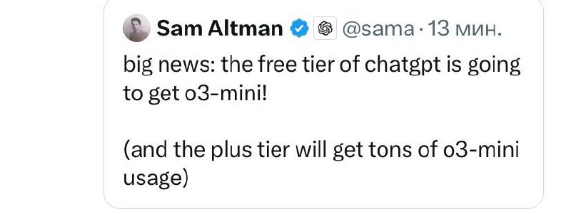 ΠΠΎΡ, ΡΡΠΎ ΠΠΈΡΠ°ΠΉ Π΄Π΅Π»Π°Π΅Ρ Ρ OpenAI! Π‘ΡΠΌ ΠΎΠ±ΡΡΠ²ΠΈΠ» ΠΎ Π±Π΅ΡΠΏΠ»Π°ΡΠ½ΠΎΠΌ ΠΏΠΎΠ»ΡΠ·ΠΎΠ²Π°Π½ΠΈΠΈ ΠΌΠΎΠ΄Π΅Π»ΠΈ o3-mini Π΄Π»Ρ Π²ΡΠ΅Ρ ΠΈ Π΄Π»Ρ ΠΏΠΎΠ»ΡΠ·ΠΎΠ²Π°ΡΠ΅Π»Π΅ΠΉ ΠΏΠ»Π°ΡΠ½ΠΎΠΉ Π²Π΅ΡΡΠΈΠΈ (Plus).