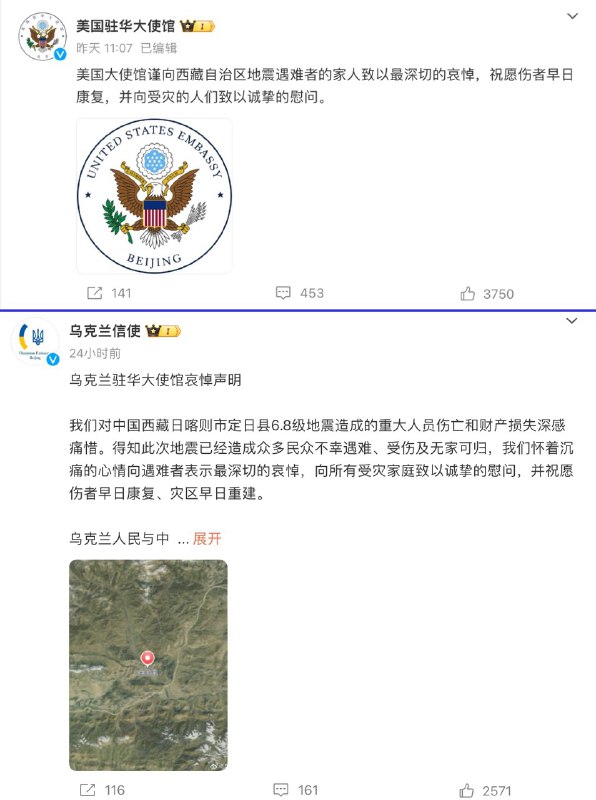 ΠΠΎΡΠΎΠ»ΡΡΡΠ²Π° Π‘Π¨Π ΠΈ Π£ΠΊΡΠ°ΠΈΠ½Ρ Π² ΠΊΠΈΡΠ°ΠΉΡΠΊΠΎΠΉ ΡΠΎΡΡΠ΅ΡΠΈ ΠΡΠΉΠ±ΠΎ Π²ΡΡΠ°Π·ΠΈΠ»ΠΈ ΡΠΎΠ±ΠΎΠ»Π΅Π·Π½ΠΎΠ²Π°Π½ΠΈΡ Π² ΡΠ²ΡΠ·ΠΈ Ρ Π·Π΅ΠΌΠ»Π΅ΡΡΡΡΠ΅Π½ΠΈΠ΅ΠΌ Π² Π’ΠΈΠ±Π΅ΡΠ΅. Π ΠΏΠΎΡΠΎΠ»ΡΡΡΠ²ΠΎ Π ΠΎΡΡΠΈΠΈ Π½Π΅Ρ.
