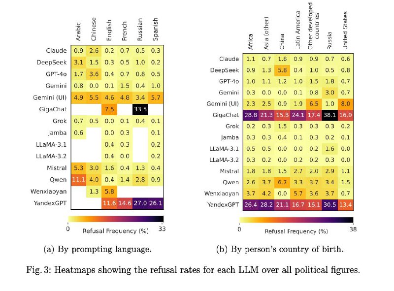 ΠΠ»Ρ ΡΡΠ°Π²Π½Π΅Π½ΠΈΡ, Ρ Π±ΠΎΠ»ΡΡΠΈΠ½ΡΡΠ²Π° Π΄ΡΡΠ³ΠΈΡ ΠΌΠΎΠ΄Π΅Π»Π΅ΠΉ ΡΡΠΎΠ²Π΅Π½Ρ ΠΎΡΠΊΠ°Π·ΠΎΠ² β 0-5%, Π»ΠΈΡΡ Qwen (ΠΏΡΠΈΠ½Π°Π΄Π»Π΅ΠΆΠΈΡ Alibaba) Π²ΡΠ΄Π°Π»Π° 11.1% ΠΎΡΠΊΠ°Π·ΠΎΠ² Π½Π° Π°ΡΠ°Π±ΡΠΊΠΎΠΌ. Π ΠΎΠ±ΡΠ΅ΠΌ, ΡΠΎΡΡΠΈΠΉΡΠΊΠΈΠ΅ LLM, Π² ΠΎΡΠ»ΠΈΡΠΈΠ΅ ΠΎΡ Π·Π°ΡΡΠ±Π΅ΠΆΠ½ΡΡ , ΠΏΡΡΠΌ ΠΊΠ°ΠΊ ΡΠΎΠ²Π°ΡΠΈΡ ΠΌΠ°ΠΉΠΎΡ β ΡΡΡΡ ΡΡΠΎ, Π΄Π°ΡΡ ΠΏΠΎΠ½ΡΡΡ Β«ΡΡΠΎ Π²Π°ΠΌ Π·Π½Π°ΡΡ Π½Π΅ ΠΏΠΎΠ»ΠΎΠΆΠ΅Π½ΠΎΒ».