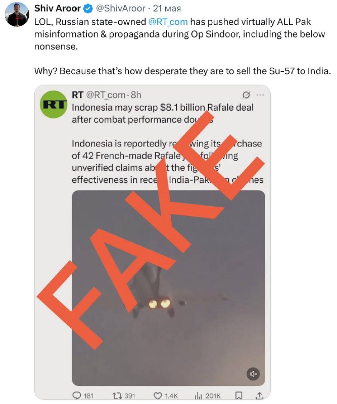 Лол, российский государственный @RT_com распространял практически ВСЮ пакистанскую дезинформацию и пропаганду во время операции «Синдур», включая приведенную ниже чушь.