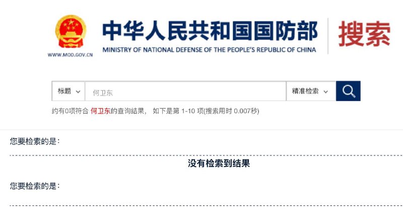 Поиск на сайте Министерства обороны по заголовкам статей выдает нулевой результат. В то время как такой же поиск по другому заму Чжан Юся показывает 203 ссылки.