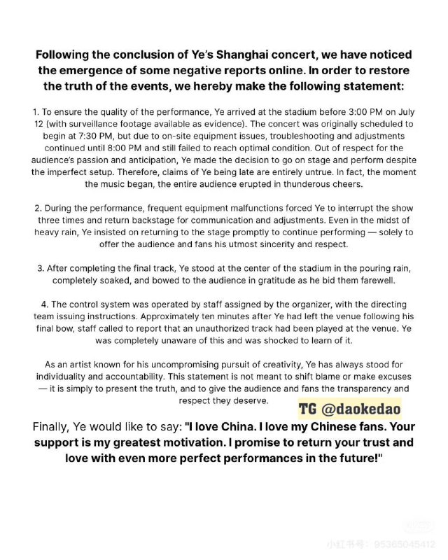ΠΠ°Π½ΡΠ΅ ΠΏΡΠΈΠ½Π΅Ρ ΡΠ²ΠΎΠΈ ΠΈΠ·Π²ΠΈΠ½Π΅Π½ΠΈΡ ΠΊΠΈΡΠ°ΠΉΡΠΊΠΈΠΌ ΡΠ°Π½Π°ΡΠ°ΠΌ Π½Π° ΠΊΠΈΡΠ°ΠΉΡΠΊΠΎΠΌ ΠΈ Π°Π½Π³Π»ΠΈΠΉΡΠΊΠΎΠΌ ΡΠ·ΡΠΊΠ°Ρ Π·Π° ΠΏΠ»ΠΎΡ ΠΎ ΠΏΡΠΎΠ²Π΅Π΄Π΅Π½Π½ΡΠΉ ΠΊΠΎΠ½ΡΠ΅ΡΡ. ΠΠΎ Π²ΡΠ΅ΠΌ Π²ΠΈΠ½ΠΎΠ²Π°ΡΠ° Π°ΠΏΠΏΠ°ΡΠ°ΡΡΡΠ° ΠΈ Π»ΠΈΠ²Π΅Π½Ρ.