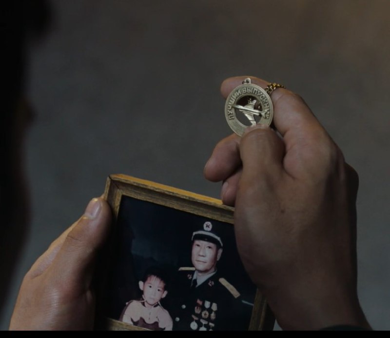 Во второй сцене молодой китайский пилот (на фото со скриншота он с дедушкой) рассказывает, что никогда не видел своего отца. Тот окончил за рубежом военное училище (на это указывает кулон с надписью на русском языке «Лучший выпускник«), но после выпуска сразу погиб во время лётных испытаний.