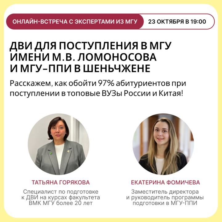 Приглашаем на онлайн-встречу с экспертами из МГУ, где мы расскажем о дополнительных вступительных испытаниях для поступления в МГУ и МГУ-ППИ в Шеньчжене.