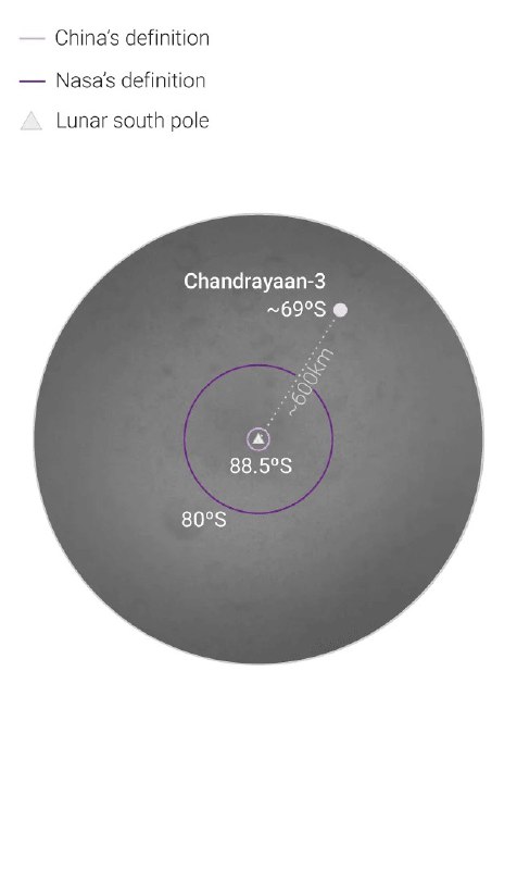Но китайский ученый сообщил, что такая формулировка Моди неточна. По словам Оуяна, «Чандраян-3» не садился ни на южном полюсе Луны, ни в полярной области южного полюса, ни вблизи Антарктического полярного региона. Модуль прилунился на уровне 69° южной широты. Эти координаты находится в южном полушарии Луны, но не в полярном регионе, который, по мнению ученого, находится между 88,5° и 90°.
