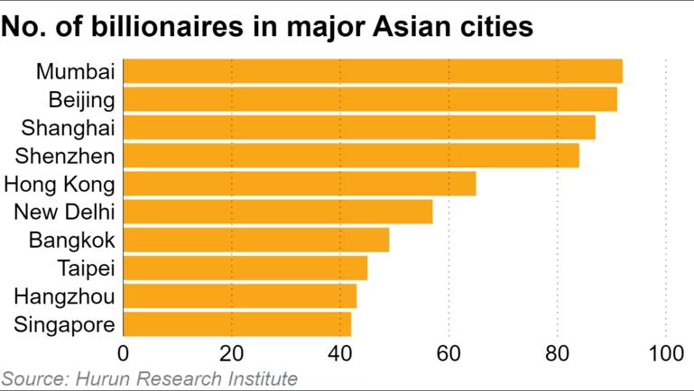 Π ΠΠ·ΠΈΠΈ Π½ΠΎΠ²ΠΎΠΉ Β«ΡΡΠΎΠ»ΠΈΡΠ΅ΠΉ ΠΌΠΈΠ»Π»ΠΈΠ°ΡΠ΄Π΅ΡΠΎΠ²Β» Π²ΠΏΠ΅ΡΠ²ΡΠ΅ ΡΡΠ°Π» ΠΡΠΌΠ±Π°ΠΈ. ΠΠΎ Π΄Π°Π½Π½ΡΠΌ ΡΠ΅ΠΉΡΠΈΠ½Π³Π° Hurun Global Rich List, Π² ΠΈΠ½Π΄ΠΈΠΉΡΠΊΠΎΠΌ ΠΌΠ΅Π³Π°ΠΏΠΎΠ»ΠΈΡΠ΅ ΠΏΡΠΎΠΆΠΈΠ²Π°ΡΡ 92 ΠΌΠΈΠ»Π»ΠΈΠ°ΡΠ΄Π΅ΡΠ°, Π² ΠΠ΅ΠΊΠΈΠ½Π΅ β 91.