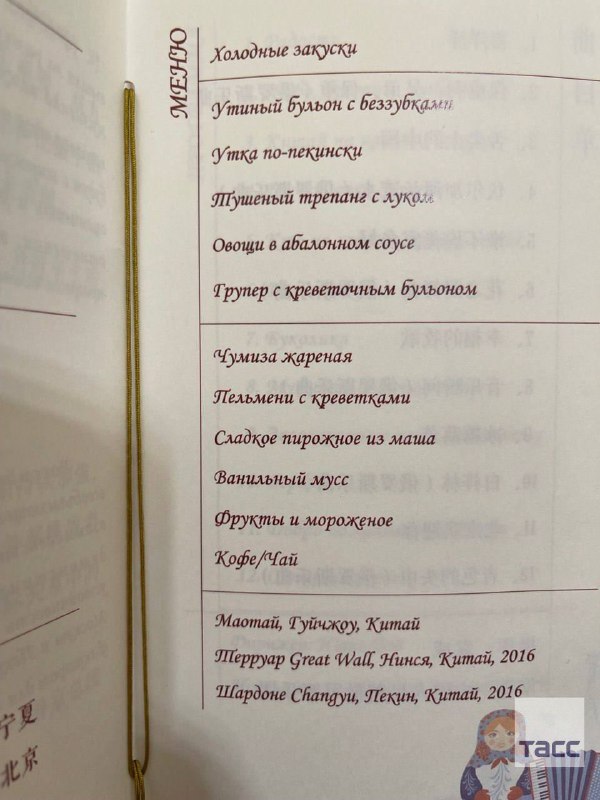 Меню на торжественном приеме в Пекине в честь Путина