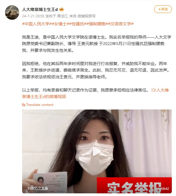21 ΠΈΡΠ»Ρ ΠΠ°Π½ ΠΠΈ β Π΄ΠΎΠΊΡΠΎΡΠ°Π½ΡΠΊΠ° ΠΠΈΡΠ°ΠΉΡΠΊΠΎΠ³ΠΎ Π½Π°ΡΠΎΠ΄Π½ΠΎΠ³ΠΎ ΡΠ½ΠΈΠ²Π΅ΡΡΠΈΡΠ΅ΡΠ° β ΠΎΠΏΡΠ±Π»ΠΈΠΊΠΎΠ²Π°Π»Π° Π²ΠΈΠ΄Π΅ΠΎ Π½Π° ΠΏΠ»Π°ΡΡΠΎΡΠΌΠ΅ Weibo, Π² ΠΊΠΎΡΠΎΡΠΎΠΌ ΠΎΠ±Π²ΠΈΠ½ΠΈΠ»Π° ΠΏΡΠΎΡΠ΅ΡΡΠΎΡΠ° ΠΠ°Π½ ΠΡΠΉΡΠ°Π½Ρ Π² ΡΠ΅ΠΊΡΡΠ°Π»ΡΠ½ΡΡ Π΄ΠΎΠΌΠΎΠ³Π°ΡΠ΅Π»ΡΡΡΠ²Π°Ρ ΠΈ ΠΏΡΠΈΠ½ΡΠ΄ΠΈΡΠ΅Π»ΡΠ½ΡΡ Π΄Π΅ΠΉΡΡΠ²ΠΈΡΡ ΡΠ΅ΠΊΡΡΠ°Π»ΡΠ½ΠΎΠ³ΠΎ Ρ Π°ΡΠ°ΠΊΡΠ΅ΡΠ°. ΠΠΎ Π΅Π΅ ΡΠ»ΠΎΠ²Π°ΠΌ, ΠΈΠ½ΡΠΈΠ΄Π΅Π½Ρ ΠΏΡΠΎΠΈΠ·ΠΎΡΠ΅Π» 21 ΠΌΠ°Ρ 2022 Π³ΠΎΠ΄Π°. ΠΠ°Π½ ΠΠΈ ΠΎΡΠΊΠ°Π·Π°Π»Π°ΡΡ ΠΎΡ ΠΏΡΠ΅Π΄Π»ΠΎΠΆΠ΅Π½ΠΈΠΉ ΠΏΡΠΎΡΠ΅ΡΡΠΎΡΠ°, ΠΈ ΠΎΠ½ Π² ΡΠ΅ΡΠ΅Π½ΠΈΠ΅ Π΄Π²ΡΡ Π»Π΅Ρ ΡΠ³ΡΠΎΠΆΠ°Π», ΡΡΠΎ ΠΎΠ½Π° Π½Π΅ ΡΠΌΠΎΠΆΠ΅Ρ Π·Π°ΡΠΈΡΠΈΡΡ Π΄ΠΈΡΡΠ΅ΡΡΠ°ΡΠΈΡ.