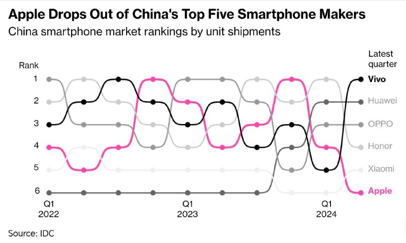 Apple потерял позиции на китайском рынке смартфонов во втором квартале 2024, уступив местным брендам: Vivo, Huawei, Oppo, Honor, Xiaomi. В результате Apple заняла шестое место на рынке, впервые за четыре года не попав в топ-5.