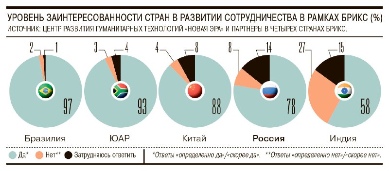 Социологи выяснили, что в пяти странах БРИКС думают об организации и друг о друге. В опросе участвовали по 1 тыс. респондентов от 18 до 35 лет в Бразилии, Китае, ЮАР, Индии и РФ.
