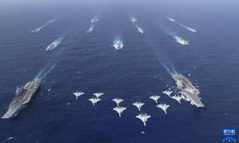 Судя по фотографиям ВМС НОАК, помимо двух авианосцев в состав группы входило не менее 11 судов, в том числе эсминцы, фрегаты и корабли снабжения. Несколько истребителей J-15 взлетели с палубы авианосца и пролетели над водой.