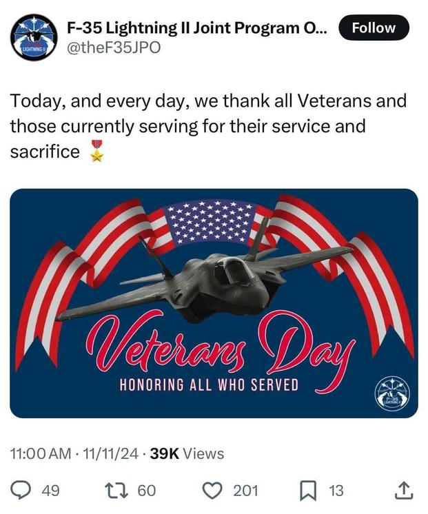 ΠΡΠΈΡ ΡΠΎΠ²ΠΌΠ΅ΡΡΠ½ΠΎΠΉ ΠΏΡΠΎΠ³ΡΠ°ΠΌΠΌΡ ΠΠ΅Π½ΡΠ°Π³ΠΎΠ½Π° ΠΏΠΎ ΠΈΡΡΡΠ΅Π±ΠΈΡΠ΅Π»Ρ F-35 (F-35 Lightning II Joint Program Office) ΠΎΠΏΡΠ±Π»ΠΈΠΊΠΎΠ²Π°Π» Π½Π° ΡΠΎΡΠΎ Π² ΡΠΎΡΡΠ΅ΡΡΡ ΠΈΡΡΡΠ΅Π±ΠΈΡΠ΅Π»Ρ, Π½Π°ΠΏΠΎΠΌΠΈΠ½Π°ΡΡΠΈΠΉ ΠΊΠΈΡΠ°ΠΉΡΠΊΠΈΠΉ J-35. ΠΠΎΡΡ Π±ΡΠ» ΠΏΡΠΈΡΡΠΎΡΠ΅Π½ ΠΊ ΠΠ½Ρ Π²Π΅ΡΠ΅ΡΠ°Π½ΠΎΠ², ΠΏΠΎΡΠ²ΡΡΠ΅Π½Π½ΠΎΠΌΡ Π±ΡΠ²ΡΠΈΠΌ Π²ΠΎΠ΅Π½Π½ΠΎΡΠ»ΡΠΆΠ°ΡΠΈΠΌ Π‘Π¨Π. ΠΡΠ°Π·Π΄Π½ΠΈΠΊ ΠΎΡΠΌΠ΅ΡΠ°Π»ΡΡ 11 Π½ΠΎΡΠ±ΡΡ.