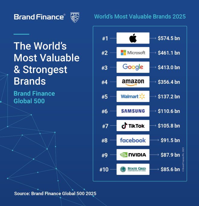ΠΠ΅ΡΠ²ΡΠ΅ ΡΠΎΠΏ-5 ΡΠ°ΠΊΠΆΠ΅ Π°ΠΌΠ΅ΡΠΈΠΊΠ°Π½ΡΠΊΠΈΠ΅. ΠΠΎΠ·Π³Π»Π°Π²Π»ΡΠ΅Ρ ΡΠ΅ΠΉΡΠΈΠ½Π³ Apple ($574,5 ΠΌΠ»ΡΠ΄), Π·Π° Π½ΠΈΠΌ ΡΠ»Π΅Π΄ΡΠ΅Ρ Microsoft ($461,1 ΠΌΠ»ΡΠ΄). Π’ΡΠ΅ΡΡΠ΅ ΠΌΠ΅ΡΡΠΎ Π·Π°Π½ΠΈΠΌΠ°Π΅Ρ Google ($413 ΠΌΠ»ΡΠ΄). ΠΠ°ΠΌΡΠΊΠ°ΡΡ ΠΏΡΡΠ΅ΡΠΊΡ Amazon ($356,4 ΠΌΠ»ΡΠ΄) ΠΈ Walmart ($137,2 ΠΌΠ»ΡΠ΄).