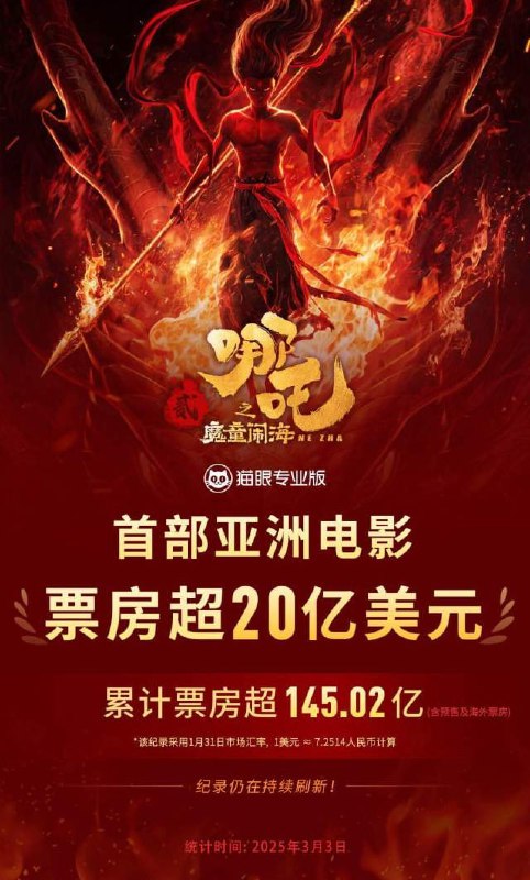 ΠšΠ°ΡΡΠΎΠ²Ρ‹Π΅ сборы «НэчТа 2Β» («НэчТа ΠΏΠΎΠ±Π΅ΠΆΠ΄Π°Π΅Ρ‚ Царя Π΄Ρ€Π°ΠΊΠΎΠ½ΠΎΠ²Β») достигли ΠΎΡ‚ΠΌΠ΅Ρ‚ΠΊΠΈ Π² 14,5 ΠΌΠ»Ρ€Π΄ юанСй ($2 ΠΌΠ»Ρ€Π΄). Π­Ρ‚ΠΎ пСрвая азиатская ΠΊΠ°Ρ€Ρ‚ΠΈΠ½Π° с Ρ‚Π°ΠΊΠΈΠΌΠΈ сборами.
