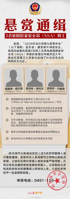 ΠΡΡΠΎ ΠΎΠ±ΡΠ΅ΡΡΠ²Π΅Π½Π½ΠΎΠΉ Π±Π΅Π·ΠΎΠΏΠ°ΡΠ½ΠΎΡΡΠΈ Π³ΠΎΡΠΎΠ΄Π° Π₯Π°ΡΠ±ΠΈΠ½ (ΠΏΡΠΎΠ²ΠΈΠ½ΡΠΈΡ Π₯ΡΠΉΠ»ΡΠ½ΡΠ·ΡΠ½) ΠΎΠ±ΡΡΠ²ΠΈΠ»ΠΎ Π² ΡΠΎΠ·ΡΡΠΊ ΡΡΠ΅Ρ ΡΠΎΡΡΡΠ΄Π½ΠΈΠΊΠΎΠ² ΠΠ³Π΅Π½ΡΡΡΠ²Π° Π½Π°ΡΠΈΠΎΠ½Π°Π»ΡΠ½ΠΎΠΉ Π±Π΅Π·ΠΎΠΏΠ°ΡΠ½ΠΎΡΡΠΈ Π‘Π¨Π: ΠΡΡΡΠΈΠ½ Π£ΠΈΠ»ΡΠΎΠ½ (Katheryn A. Wilson), Π ΠΎΠ±Π΅ΡΡΠ° Π‘Π½Π΅Π»Π»ΠΈΠ½Π³Π° (Robert J. Snelling) ΠΈ Π‘ΡΠΈΠ²Π΅Π½Π° ΠΠΆΠΎΠ½ΡΠΎΠ½Π° (Stephen W. Johnson).