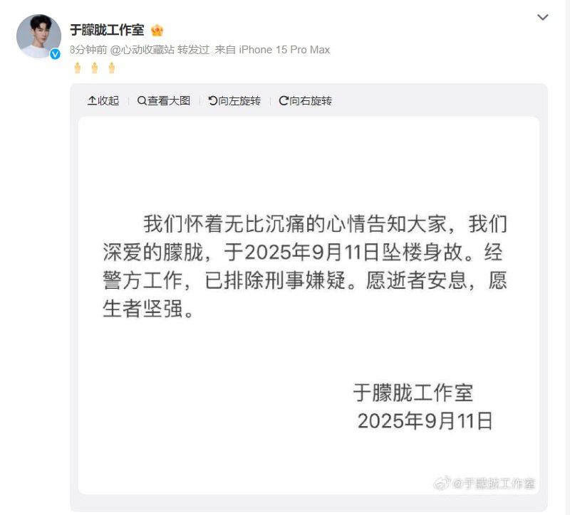 «С глубоким прискорбием сообщаем, что наш любимый Мэнлун скончался 11 сентября после падения. Согласно результатам полицейского расследования, криминальная составляющая исключена. Да упокоится он с миром, а живущие пусть сохранят силу духа», — говорится в сообщении.